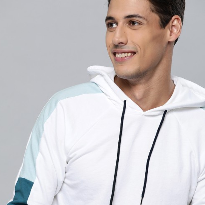 Men White & Navy Blue Colourblocked Hooded Sweatshirt