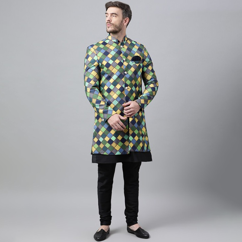 Men Green & Yellow Printed Long Sleeves Sherwani