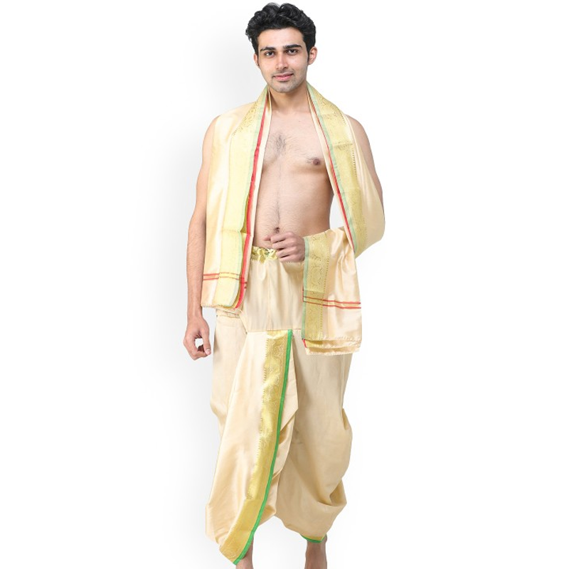 Men Cream and Gold-Toned Solid Dhoti With Angavastram